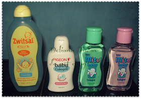 saat ini ada empat varian cologne bayi yang saya punya, dua dari Mitu Baby, satu dari Zwitsal dan satu dari Pigeon. Zwitsal adalah cologne yang paling sering saya pakai. wanginya bayi banget. kalau dari Mitu Baby wanginya lebih tahan lama, namun menurut saya wanginya kurang bayi banget. sedangkan Pigeon adalah yang paling jarang saya pakai, karena wanginya ngga tahan lama, walaupun seger sih, aroma bunga-bungaan gitu.