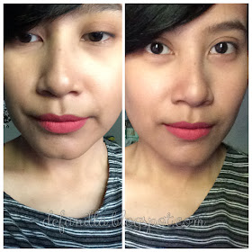 Di bibir saya jatuhnya merah dengan hint oranye. Lagi-lagi saya kurang suka. Kenapa? Yaktul, karena merahnya ada hint oranyenya. Walaupun samar, tapi saya tetep nggak suka.